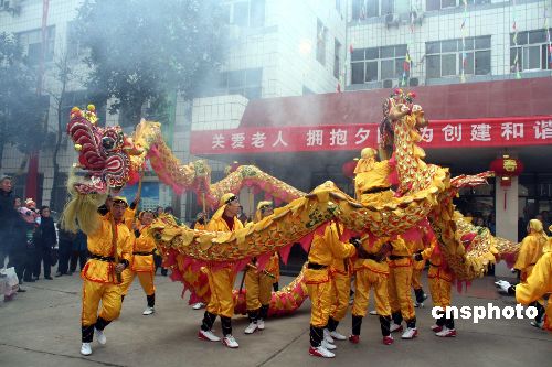 2月13日是春節(jié)后上班首日。湖北武漢江漢區(qū)常青街組織舞龍隊專程到轄區(qū)武漢社會福利院,為老人們做舞龍表演。中新社發(fā) 李長林 攝