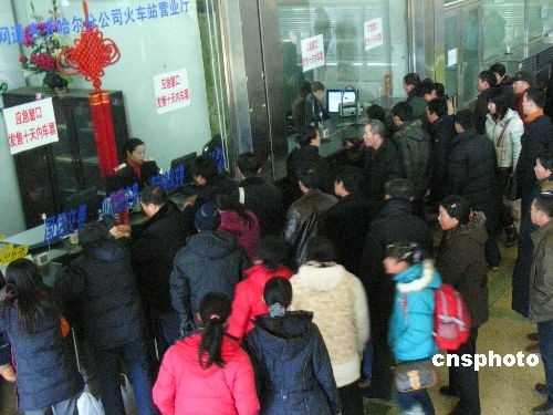 2月15日,人們?cè)邶R齊哈爾火車(chē)站售票大廳購(gòu)票。當(dāng)日,齊齊哈爾火車(chē)站在探親返城客流和農(nóng)民工客流出現(xiàn)高峰后,又迎來(lái)學(xué)生客流高峰,日送來(lái)往旅客達(dá)2.5萬(wàn)人。為緩解購(gòu)票難,車(chē)站增加了應(yīng)急售票窗口,車(chē)站派出所派出警力24小時(shí)巡查,并在廣場(chǎng)設(shè)置一臺(tái)報(bào)警服務(wù)車(chē),隨時(shí)為旅客提供服務(wù)。 中新社發(fā) 王云龍 攝