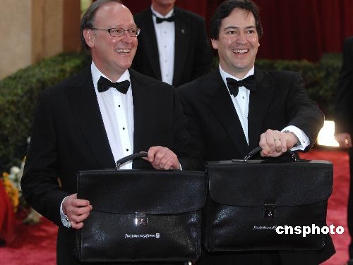 當(dāng)?shù)貢r(shí)間2月24日晚,第八十屆奧斯卡頒獎(jiǎng)典禮在好萊塢柯達(dá)劇場(chǎng)舉行。在奧斯卡金像獎(jiǎng)?lì)C獎(jiǎng)典禮開始前,美國普華永道會(huì)計(jì)事務(wù)所的兩位會(huì)計(jì)師布萊德(左)和瑞克向記者展示兩個(gè)公文包,這里裝的就是奧斯卡各獎(jiǎng)項(xiàng)的最終結(jié)果。兩位會(huì)計(jì)師是最早知道奧斯卡結(jié)果的人。中新社發(fā) 張煒 攝