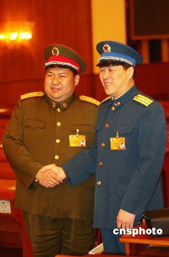三月八日上午,全國政協(xié)十一屆一次會(huì)議第二次全體會(huì)議在北京人民大會(huì)堂舉行。毛澤東之孫、解放軍軍事科學(xué)院戰(zhàn)爭理論和戰(zhàn)略研究部研究員毛新宇出席,與朱德的孫子——空軍指揮學(xué)院副院長朱和平握手并合影。中新社發(fā) 盛佳鵬 攝
