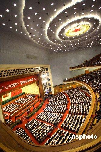 3月11日下午,十一屆全國(guó)人大一次會(huì)議在北京人民大會(huì)堂舉行第四次全體會(huì)議,聽(tīng)取國(guó)務(wù)委員兼國(guó)務(wù)院秘書長(zhǎng)華建敏關(guān)于國(guó)務(wù)院機(jī)構(gòu)改革方案的說(shuō)明。中新社發(fā) 任晨鳴 攝