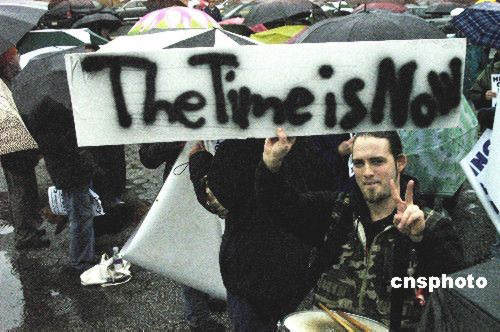 3月19日是美國對(duì)伊開戰(zhàn)五周年日。在美國紐約多個(gè)反戰(zhàn)組織以集會(huì)游行的方式要求政府結(jié)束伊戰(zhàn)。圖為在紐約的一個(gè)反戰(zhàn)集會(huì)上,一名美國青年一手比劃著和平的標(biāo)志,一手舉著標(biāo)語牌,上面寫著:(撤軍的)時(shí)間就是現(xiàn)在。中新社發(fā) 鄧悅 攝