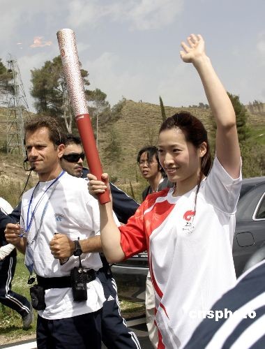 希臘當(dāng)?shù)貢r間3月24日,北京二00八年奧運會圣火采集儀式在古奧林匹亞競技場舉行,隨后火炬希臘傳遞開始。第一位中國火炬手羅雪娟一邊傳遞圣火一邊向觀眾揮手致意。中新社發(fā) 王歡 攝