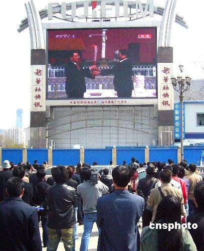 3月31日,北京站旅客在廣場(chǎng)大屏幕前觀看奧運(yùn)圣火傳遞直播。當(dāng)天,2008奧運(yùn)圣火啟動(dòng)儀式在北京天安門廣場(chǎng)隆重舉行,胡錦濤主席親自點(diǎn)燃了北京奧運(yùn)會(huì)圣火,并宣布奧運(yùn)圣火傳遞正式啟動(dòng)。北京站前廣場(chǎng)大屏幕直播的盛大場(chǎng)面,吸引了眾多旅客駐足觀看。 中新社發(fā) 玉龍 攝