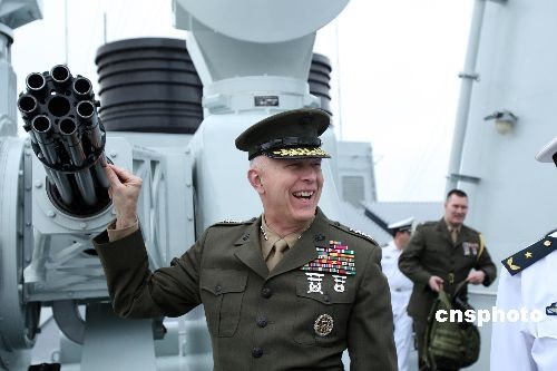 4月2日,美國(guó)海軍陸戰(zhàn)隊(duì)司令詹姆斯·康威上將一行開(kāi)始對(duì)中國(guó)南海艦隊(duì)進(jìn)行為期2天的參觀訪問(wèn)。南海艦隊(duì)副參謀長(zhǎng)么志樓少將下午陪同康威上將前往湛江軍港,登上中國(guó)海軍“武漢”號(hào)導(dǎo)彈驅(qū)逐艦和“羅霄山”號(hào)登陸艦參觀?低d致勃勃地參觀了艦艇指揮作戰(zhàn)室、駕駛室和艦載武器等核心部位,聽(tīng)取了解說(shuō)員對(duì)艦艇有關(guān)性能的介紹?低䦟(duì)中國(guó)軍隊(duì)的開(kāi)放程度、透明程度和現(xiàn)代化程度表示稱贊。圖為康威上將參觀“武漢”號(hào)導(dǎo)彈驅(qū)逐艦30炮,該軍艦是中國(guó)自行設(shè)計(jì)建造的新型現(xiàn)代化軍艦。中新社發(fā) 李唐 攝