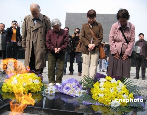 4月4日清明節(jié),在侵華日軍南京大屠殺遇難同胞紀(jì)念館祭場(chǎng)內(nèi),日本銘心會(huì)友好訪華團(tuán)團(tuán)長(zhǎng)松岡環(huán)(右二)、旅日華僑中日交流促進(jìn)會(huì)秘書長(zhǎng)林伯耀(左一)等百名日中友好人士抔土獻(xiàn)菊,祭掃南京大屠殺三十萬遇難者。中新社發(fā) 朱曉穎 攝