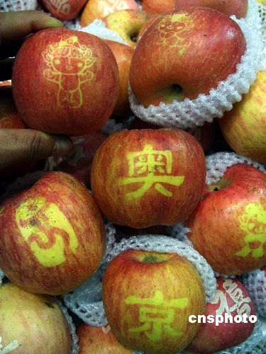 2008年4月上旬,湖北宜昌某超市里出售的蘋果上帶有“2008北京奧運”字樣及福娃圖案,十分受顧客歡迎。作者: 劉君鳳