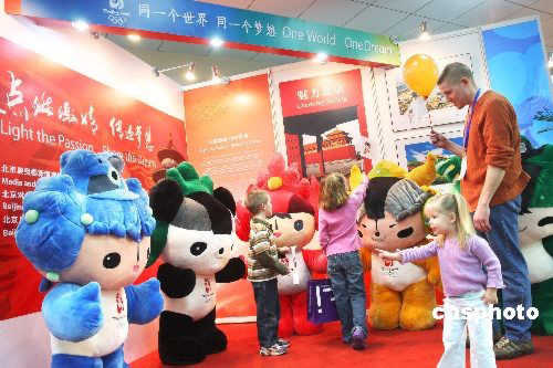 4月6日,由北京對外文化交流中心、北京月訊雜志社聯(lián)合北京奧組委新聞宣傳部舉辦的奧運(yùn)主題展覽在首屆北京旅居人士服務(wù)展覽會(huì)國貿(mào)廳亮相,吸引了大量外國朋友駐足拍照留念。這次“奧運(yùn)火炬?zhèn)鬟f”展覽以“魅力北京、奧運(yùn)之城、和諧之旅”為主題,為中外友人提供認(rèn)識北京、了解北京奧運(yùn)的平臺。中新社發(fā) 追影 攝