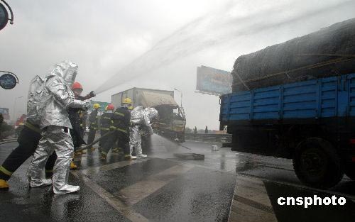 2008年4月9日,在濟青高速公路零公里處,山東省高速公路交警支隊聯(lián)合消防、醫(yī)療救護、環(huán)保等單位舉行了“迎奧運、保暢通”模擬交通事故救援演練。演練模擬在濟青高速公路零公里處,一輛油罐車與一輛貨車發(fā)生碰撞,油罐車起火,隨時都有爆炸的可能。而后面的貨車因猛烈撞擊,造成駕駛室嚴重變形,駕乘人員被困車內(nèi)。山東省高速公路交警支隊接到報警后,迅速趕到現(xiàn)場進行處理,同時啟動重特大交通事故處置聯(lián)動機制,及時通知消防、醫(yī)療救護、環(huán)保等部門聯(lián)動,并在30分鐘內(nèi)將火勢控控制,救治被困受傷人員,恢復車輛正常通行。作者: 龔輝