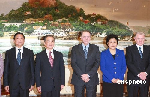 四月九日,中國國務院總理溫家寶在北京人民大會堂會見國際奧委會主席羅格(左三),國務委員劉延東(右二)、北京奧組委主席劉淇(左一)等參加了會見。中新社發(fā) 廖文靜 攝