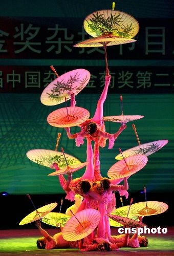 圖為由河北省雜技團演出的《詩畫韻——蹬傘》。中新社發(fā) 張勤 攝