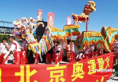 當(dāng)?shù)貢r間4月9日,北京奧運圣火傳遞舊金山,在美國的華人華僑舞獅舞龍熱烈慶祝,舞獅還“跳”上4米多高的木柱子,作空中表演。作者: 盧威