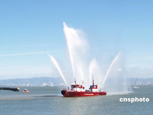 圖:救火輪噴出水柱慶祝圣火傳遞舊金山