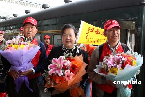 4月10日,2008年首列紅色旅游專列從廣東梅州市抵達(dá)天津,1000多名由退休老人組成的旅行團(tuán)將走訪天津及北京主要紅色旅游景點(diǎn),同時標(biāo)志著“紀(jì)念三大戰(zhàn)役勝利60周年系列主題活動”正式啟動。中新社發(fā) 趙雋 攝