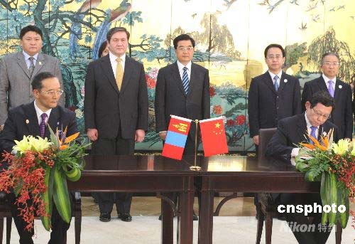 胡錦濤與蒙古總統(tǒng)恩赫巴亞爾出席簽字儀式