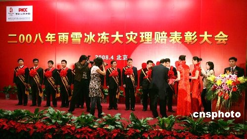 中國(guó)人民財(cái)產(chǎn)保險(xiǎn)股份有限公司(PICC)在北京舉行2008年雨雪冰凍大災(zāi)理賠表彰大會(huì),對(duì)該公司在此次大災(zāi)理賠工作中取得突出成績(jī)的單位(集體)和個(gè)人進(jìn)行表彰。中新社發(fā) 楊可佳 攝