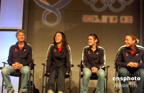 4月14日,兩次奪得奧運金牌的美國女子足球隊主要成員在芝加哥美國奧運代表團新聞峰會上表示,北京奧運會的主要目標(biāo)是奪冠。圖為去年年底剛上任的美國女足主教練皮亞(左一),前鋒凱特·馬克格拉芙(左二),后衛(wèi)奧雷利(右二)、前鋒阿比·邁巴赫(右一)。 作者: 李靜