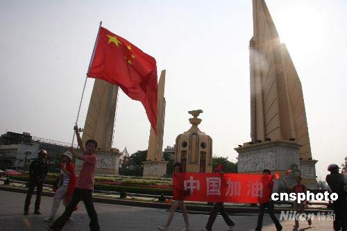 曼谷市中心的民族紀(jì)念碑被前來(lái)給火炬?zhèn)鬟f助威的中國(guó)留學(xué)生、華人華僑與當(dāng)?shù)厥忻駠盟共煌,人人都以一睹奧運(yùn)圣火為快。圖為留學(xué)生高舉國(guó)旗經(jīng)過(guò)曼谷民族紀(jì)念碑。 顧時(shí)宏 攝