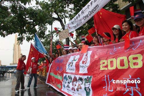 圖為中國留學(xué)生高舉國旗為曼谷奧運(yùn)圣火傳遞搖旗吶喊:“中國!加油!北京奧運(yùn)一定成功!”。 顧時宏 攝