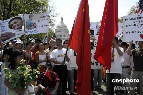 當?shù)貢r間4月19日,近千名中國留學生和當?shù)氐娜A僑華人在美國國會山前舉行示威活動,支持北京奧運,反對CNN丑化中國的評論。圖為千名留學生在國會山前振臂高呼:“不要歪曲報道!不要支持暴力!支持和平,支持奧運!” 中新社發(fā) 邱江波 攝