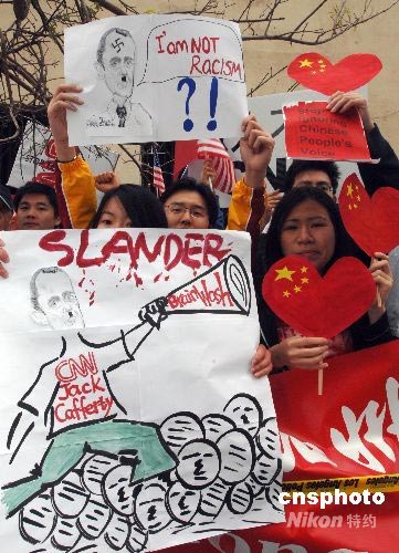 當(dāng)?shù)貢r間4月19日,洛杉磯爆發(fā)十幾年來最大規(guī)模的華人華僑抗議示威活動。數(shù)千名華人華僑和留學(xué)生在CNN洛杉磯分部門前參加和平示威,要求CNN向公開鄭重道歉,并開除卡弗蒂。圖為抗議者打出漫畫諷刺卡弗蒂利用手中話筒進(jìn)行“洗腦”。中新社發(fā) 張煒 攝