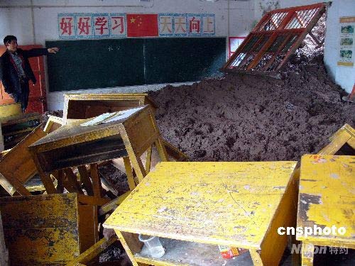 4月21日,湖北省興山縣小河村甘家坡特大山體滑坡現(xiàn)場(chǎng)。4月18日上午至20日凌晨,湖北興山縣出現(xiàn)持續(xù)暴雨天氣,最高降雨量達(dá)106毫米。19日下午5時(shí)30分,興山縣高陽鎮(zhèn)小河村甘家坡開始發(fā)生特大山體滑坡,截至20日10時(shí),滑坡體體積達(dá)6萬立方米,形成2萬立方米泥石流。該滑坡體位于高陽鎮(zhèn)中心小學(xué)背后,泥石流沖垮學(xué)校后圍墻40米,推倒學(xué)生食堂1棟3間,涌入了1樓教室并蔓延至操場(chǎng)。幸虧事發(fā)時(shí)學(xué)生逢周末放假不在校,否則可能會(huì)導(dǎo)致群死群傷的災(zāi)難性后果。目前,又有2萬立方米滑坡體已經(jīng)變形,存在繼續(xù)下滑的可能,受特大滑坡及泥石流險(xiǎn)情直接危及的高陽鎮(zhèn)中心小學(xué)已從21日起停課,甘家坡周邊37戶179人已撤出現(xiàn)場(chǎng)。中新社發(fā) 劉君鳳 攝