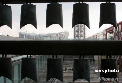 4月21日,數(shù)百只懸掛在高達(dá)十余米框架上的青銅編鐘和“吉慶大鼓”在北京奧林匹克中心區(qū)整體亮相,充滿古韻的青銅編鐘和時(shí)代氣息的紅色大鼓與現(xiàn)代建筑“鳥巢”遙相輝映,隨風(fēng)樂動(dòng)的編鐘和大鼓不時(shí)發(fā)出陣陣清脆悅耳的聲音和激情澎湃的“咚咚”聲。據(jù)悉,建成后的奧林匹克公園下沉花園將展現(xiàn)七個(gè)中國特色的院落。七個(gè)院落截取了皇城根的城市片段,在城市的中軸線和現(xiàn)代的體育場(chǎng)館之間,創(chuàng)造出全新景象。中新社發(fā) 吳芒子 攝