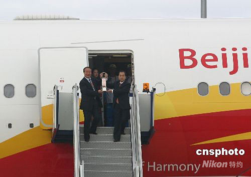 圖為北京奧組委執(zhí)行副主席蔣效愚(左)與中國駐澳大利亞大使章均賽共同手持圣火燈緩步走下飛機(jī)。作者: 沈晨