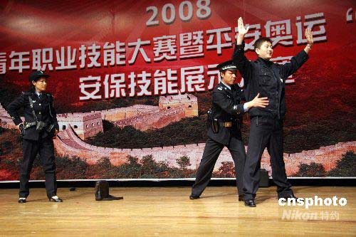 以“迎奧運(yùn)、比技能、促振興”為主題的2008沈陽(yáng)青年職業(yè)大賽開幕式暨奧運(yùn)安保技能展示大賽4月24日在沈陽(yáng)舉行。這次大賽充分展示沈陽(yáng)市公安民警關(guān)注奧運(yùn)、參與奧運(yùn)、奉獻(xiàn)奧運(yùn)的精神風(fēng)貌,通過(guò)比賽將全面提升奧運(yùn)安保人員的綜合素質(zhì)、執(zhí)法能力和實(shí)戰(zhàn)能力,打造一支高效率、高水平、符合奧運(yùn)規(guī)則、體現(xiàn)國(guó)際水平的安保服務(wù)隊(duì)伍,確保沈陽(yáng)賽區(qū)足球比賽順利進(jìn)行。中新社發(fā) 趙敬東 攝