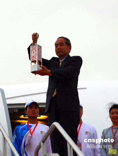 北京奧運會組織委員會副主席李炳華先生持北京奧運火種走出專機。中新社發(fā) 侯宇 攝