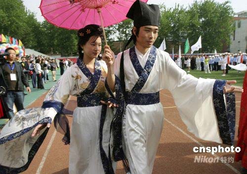 2008年4月26日,以“展奧運(yùn)人文風(fēng)采,樹建外文明形象”為主題的北京建外地區(qū)第三屆CBD文化節(jié)開幕。開幕式上,漢服展示以濃郁的中華傳統(tǒng)文化特色吸引了眾多觀眾的目光。中新社發(fā) 魯谷 攝