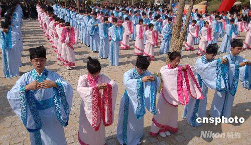 4月27日,福建閩侯縣首屆傳統(tǒng)漢服成年禮活動(dòng)在福州曇石山博物館舉行,300名中學(xué)生身著傳統(tǒng)漢服出席。整個(gè)成年禮儀活動(dòng)按傳統(tǒng)禮儀進(jìn)行,分為加冠、加笄、成人宣誓、敬師長(zhǎng)等環(huán)節(jié),是目前福建規(guī)模最大的傳統(tǒng)漢服成年禮活動(dòng)。中新社發(fā) 劉可耕 攝