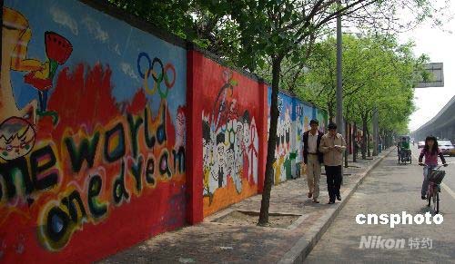 4月28日,北京第一面奧運(yùn)文化墻亮相北京理工大學(xué)西校墻,這是市民用五顏六色的顏料和噴漆材料,在長約600米、高2米多的墻上,勾畫出70多幅個(gè)性鮮明、充滿奧運(yùn)元素的涂鴉作品。作為北京市民參與奧運(yùn)環(huán)境建設(shè)的重要標(biāo)志,北京將在七城區(qū)繁華地段和高校周邊設(shè)立10面奧運(yùn)文化墻。 中新社發(fā) 九州 攝