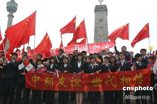 華人華僑、中國留學生在中朝友誼塔下舉著“中朝友誼 時代相傳”的標語觀看圣火傳遞。 中新社發(fā) 沈晨 攝
