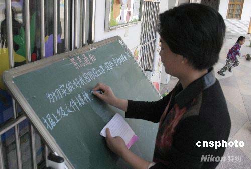 四月二十八日下午,阜陽(yáng)市振潁幼兒園老師在黑板上發(fā)布防治措施。中新社發(fā) 張婭子 攝