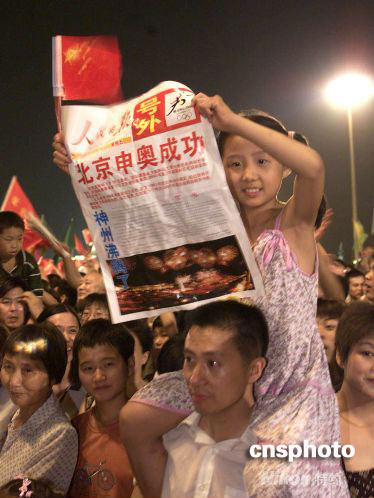 2001年7月13日夜,北京天安門廣場聚集數(shù)十萬民眾,慶祝北京申奧成功。毛建軍 攝