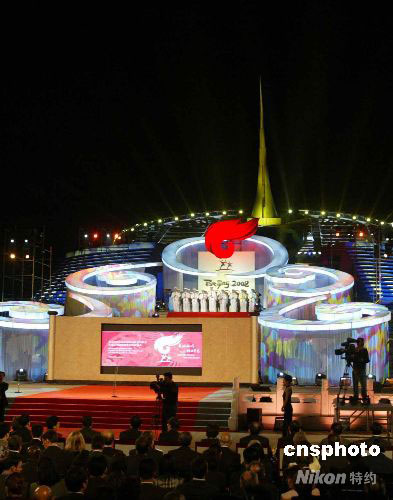 2007年4月26日晚,2008年北京奧運(yùn)會火炬?zhèn)鬟f線路與火炬設(shè)計正式公布。中新社發(fā) 任海霞 攝