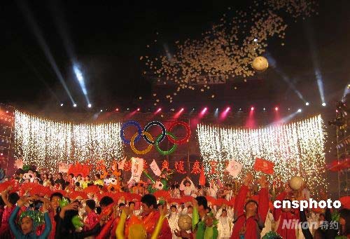 演員和觀眾振臂歡呼,臺上臺下焰火輝映,共同期待一百天后的北京奧運(yùn)盛會(huì)。 中新社發(fā) 潘海濤 攝