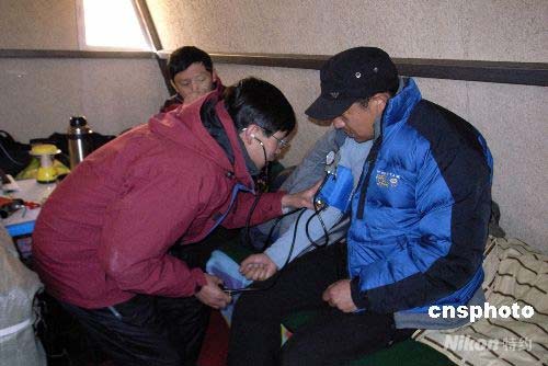 自4月28日,受邀采訪2008北京奧運會火炬接力珠峰展示活動的中外媒體入住珠峰大本營絨布新聞中心后,新聞中心住房、通訊、食宿和醫(yī)療等設(shè)施齊備且環(huán)保,為中外記者提供采訪保障。這里能找到世界上海拔最高的郵政代辦所,居住的活動房、電力設(shè)施、網(wǎng)絡(luò)等所使用的均是環(huán)保材料,符合珠峰自然保護(hù)區(qū)的各項環(huán)保規(guī)定。圖為新聞中心的醫(yī)生在為有高原反應(yīng)的記者作身體檢查。 中新社發(fā) 盛佳鵬 攝