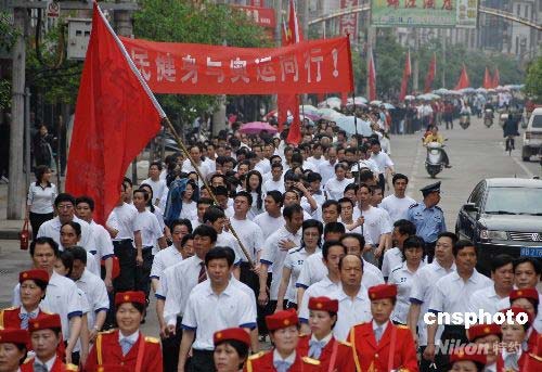 4月30日,南康市民參加健步行。當(dāng)天是北京奧運(yùn)會(huì)倒計(jì)時(shí)100天,江西南康市舉行了“慶五一,迎奧運(yùn),樹(shù)新風(fēng),促和諧”職工萬(wàn)人健步行活動(dòng),慶!拔逡弧眹(guó)際勞動(dòng)節(jié),迎接北京奧運(yùn)會(huì)。 中新社發(fā) 許朝陽(yáng) 攝