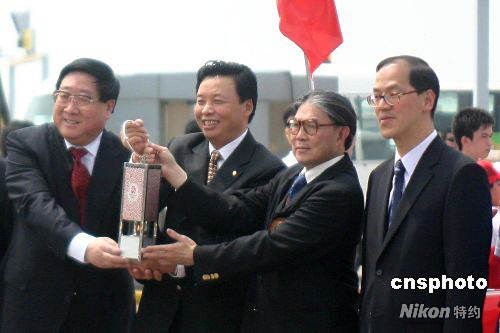 北京奧組委執(zhí)行副主席楊樹(shù)安(左二)與香港奧委會(huì)會(huì)長(zhǎng)霍震霆(右二)、中聯(lián)辦主任高祀仁(左一)等共舉圣火燈。 中新社發(fā) 沈晨 攝