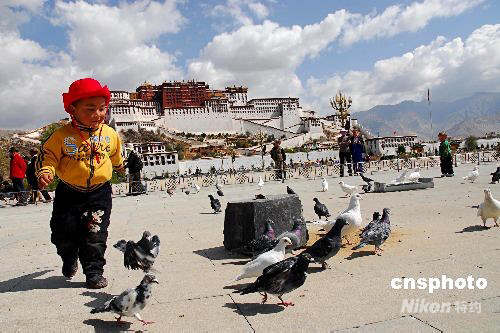 小童與鴿子嬉戲在布達(dá)拉宮廣場(chǎng)。中新社發(fā) 張權(quán) 攝