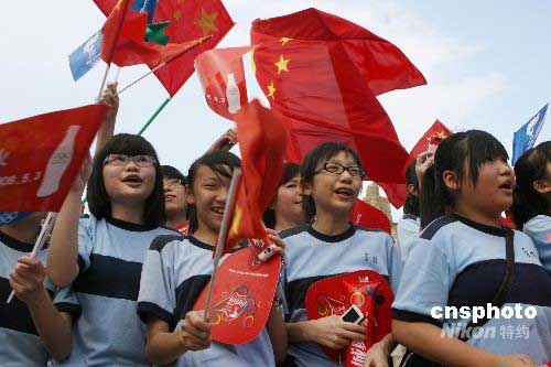 圖為學(xué)生們?cè)诮诸^為傳遞活動(dòng)加油助威。中新社發(fā) 武仲林 攝