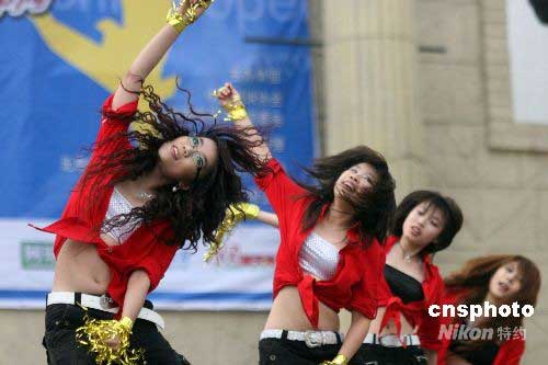 2008年“五一”期間, 2008“中網(wǎng)·網(wǎng)動中國”網(wǎng)球拉拉隊團體復賽在北京歡樂谷舉行。來自北京十幾所高校的拉拉隊選手參加了比賽,進入前三名的選手將取得2008中國網(wǎng)球公開賽拉拉隊的資格。中新社發(fā) 陳曉根 攝