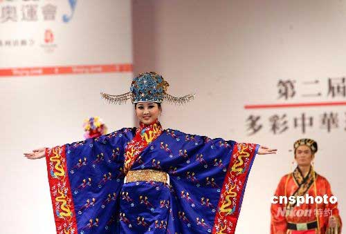 五月三日,香港各界青少年迎奧運(yùn)系列活動(dòng)委員會(huì)在香港會(huì)展中心舉辦“多彩中華迎奧運(yùn) 人文奧運(yùn)大匯演”。圖為模特在先進(jìn)燈光效果襯托下,展示珍貴歷史服飾。中新社發(fā) 洪少葵 攝