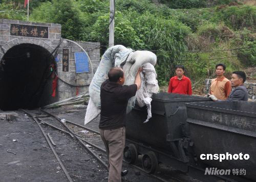 搶險隊員準備搶險物質(zhì)到發(fā)生煤與瓦斯突出事故的漣源市安平鎮(zhèn)新橋煤礦進行搶救。中新社發(fā) 郭國權 攝