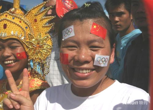一名歸僑女子在臉上貼滿奧運(yùn)五環(huán)旗和五星紅旗,滿懷欣喜迎圣火。中新社發(fā) 尹海明 攝