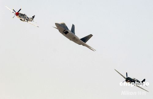 一架美軍最先進(jìn)的F-22猛禽戰(zhàn)機(jī)(中)與二戰(zhàn)時(shí)期的美軍戰(zhàn)機(jī)P-51和P-40空中共舞,讓人們體驗(yàn)航空科技的突飛猛進(jìn)。中新社發(fā) 張煒 攝
