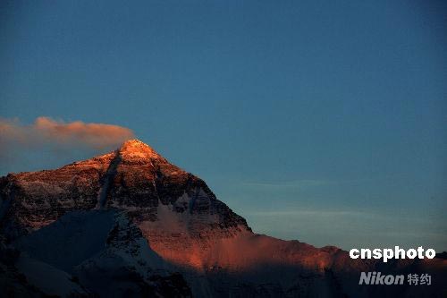 5月5日,夕陽下的珠穆朗瑪峰如燃燒的火炬。中新社發(fā) 盛佳鵬 攝