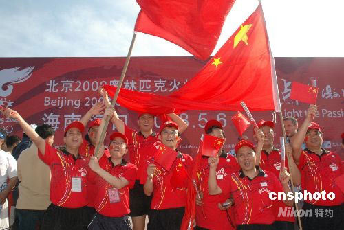 ?谑忻駬]舞著國旗在起跑儀式上為奧運(yùn)圣火順利傳遞吶喊助威。